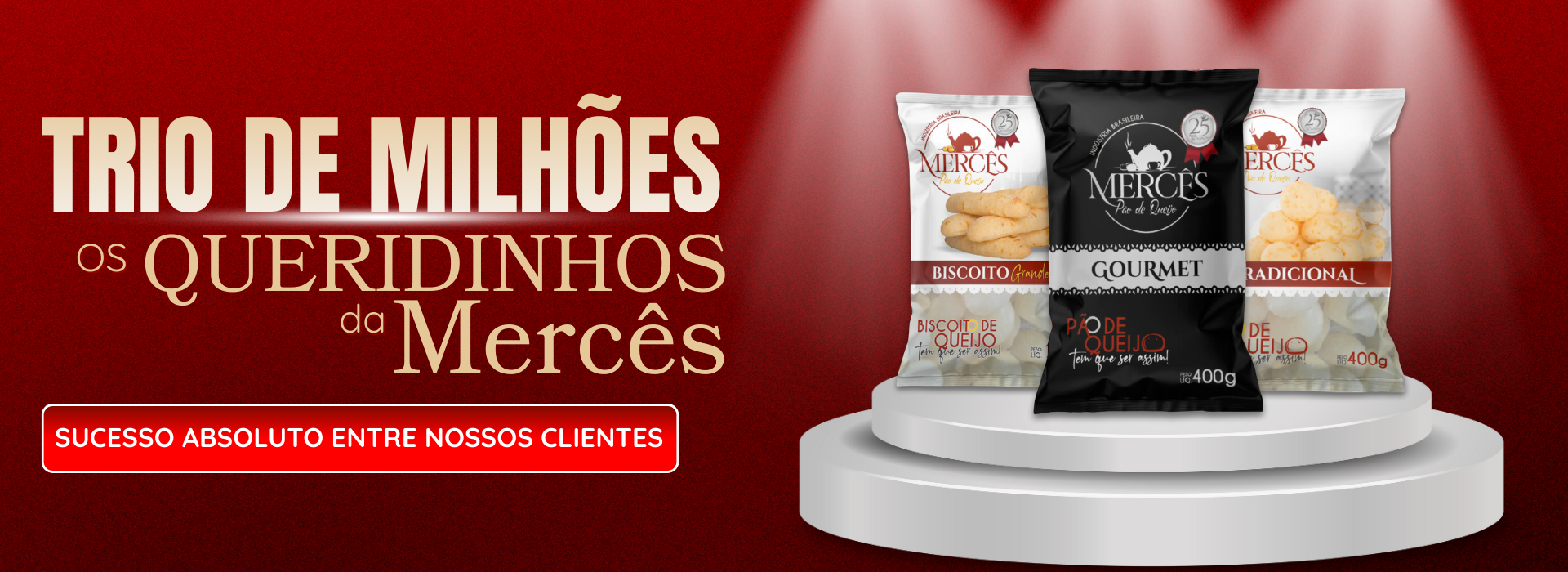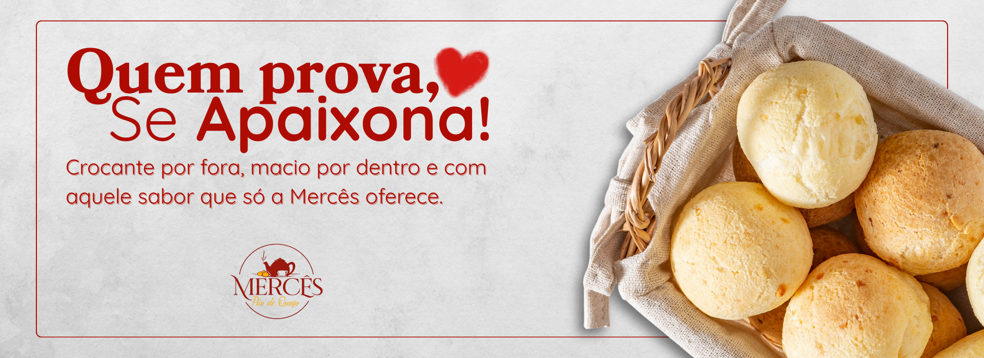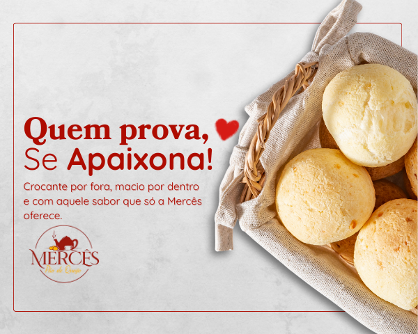 O Pão de Queijo Mercês é 100% natural, feito com queijo artesanal e receita de família. Há quem diga que tem gosto de infância. Sem conservantes e sabor marcante, prezamos pela excelência e preço justo. O portfólio cresceu em diferentes tamanhos e formatos, mas a consistência continua a mesma. Crocante por fora e macio por dentro, como o bom e velho pão de queijo da roça.
